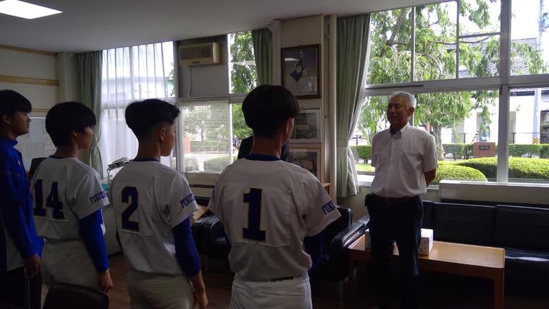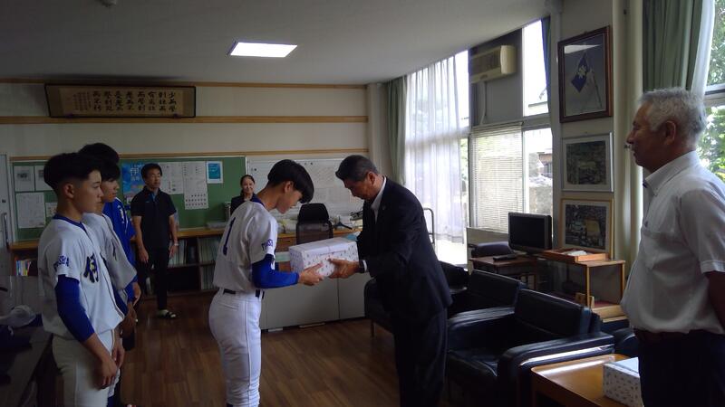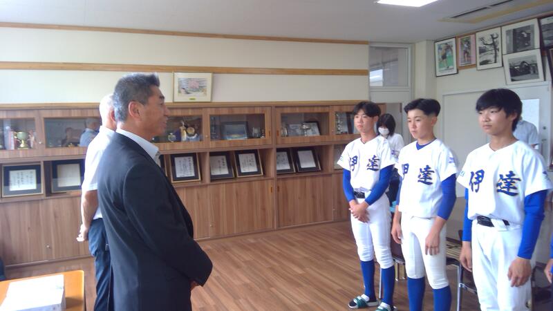 野球部OB会会長の渡邉穣嗣様、副会長で保原高校野球部監督でもあった東城一弘様が来校され、部員に激励の言葉を述べられました。「ぜひ相手に一泡ふかせてもらいたい」という力強いお言葉に、部員は「必ず勝ちます」と頼もしい答えを返しました。